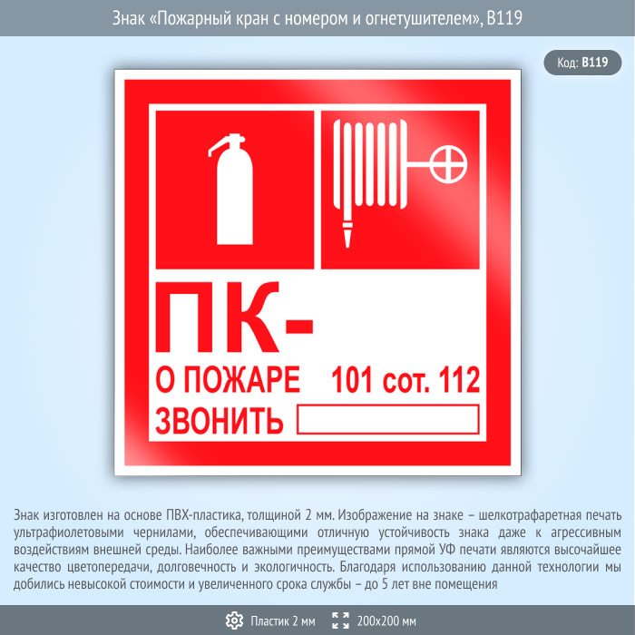 Знак «Пожарный кран с номером и огнетушителем», B119 (пластик, 200х200 мм) в Ульяновске купить