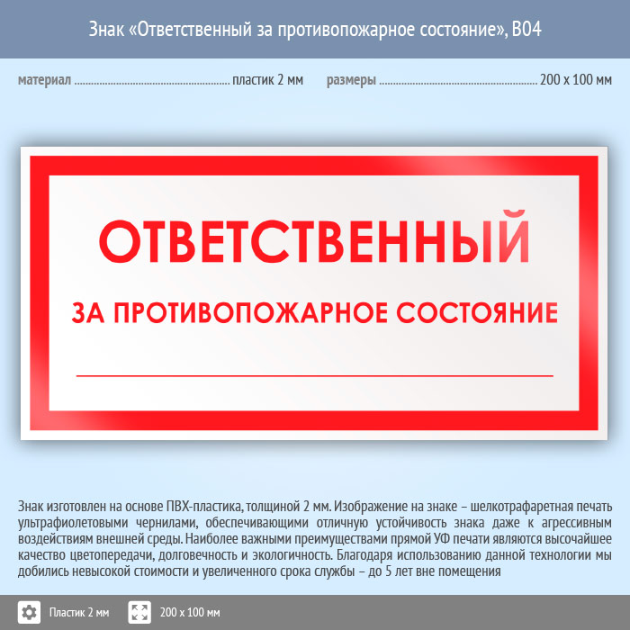 Знак «Ответственный за противопожарное состояние», B04 (пластик, 200х100 мм) в Ульяновске купить