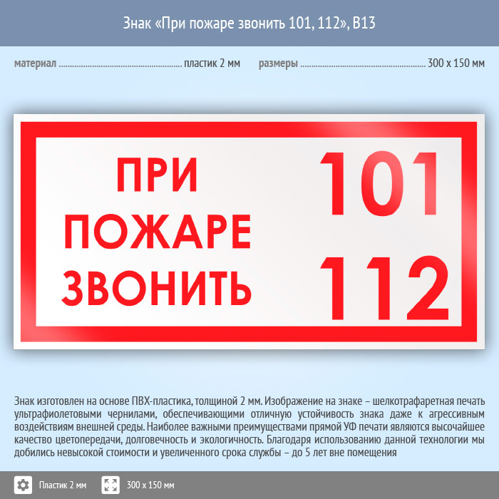Знак «При пожаре звонить 101, 112», B13 (пластик, 300х150 мм) в Ульяновске купить