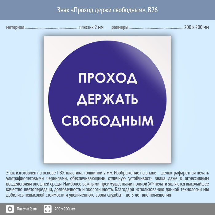 Знак «Проход держи свободным», B26 (пластик, 200х200 мм) в Ульяновске купить