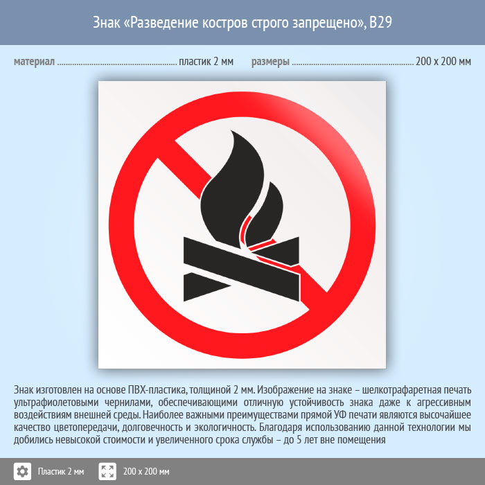 Знак «Разведение костров строго запрещено», B29 (пластик, 200х200 мм) в Ульяновске купить