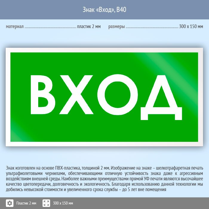 Знак «Вход», B40 (пластик, 300х150 мм) в Ульяновске купить