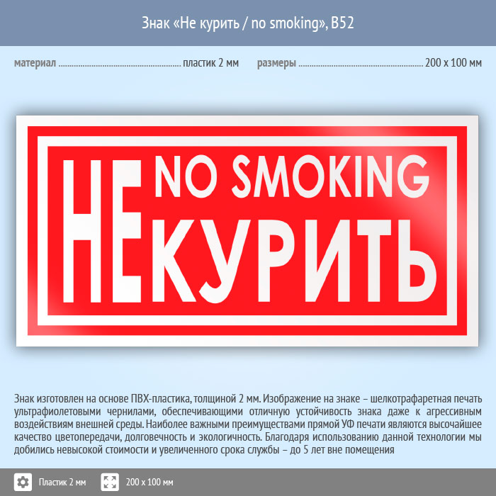 Знак «Не курить / no smoking», B52 (пластик, 200х100 мм) в Ульяновске купить