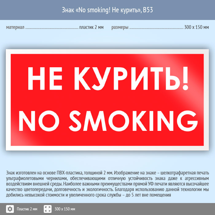 Знак «No smoking! Не курить», B53 (пластик, 300х150 мм) в Ульяновске купить