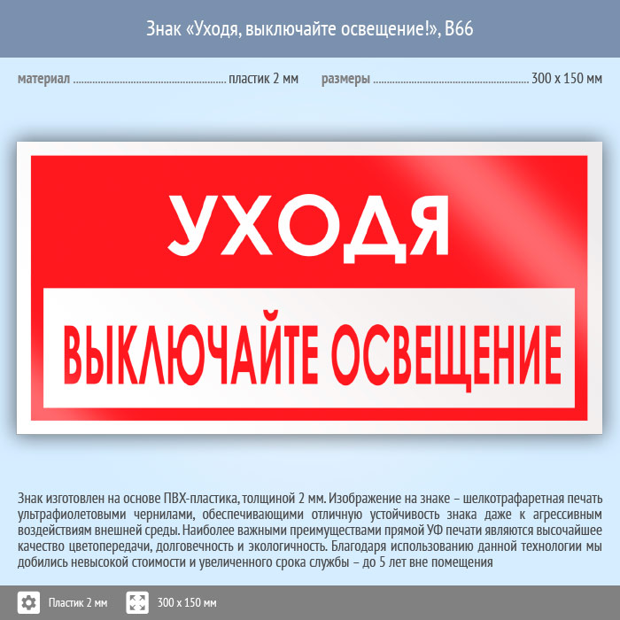 Знак «Уходя, выключайте освещение!», B66 (пластик, 300х150 мм) в Ульяновске купить
