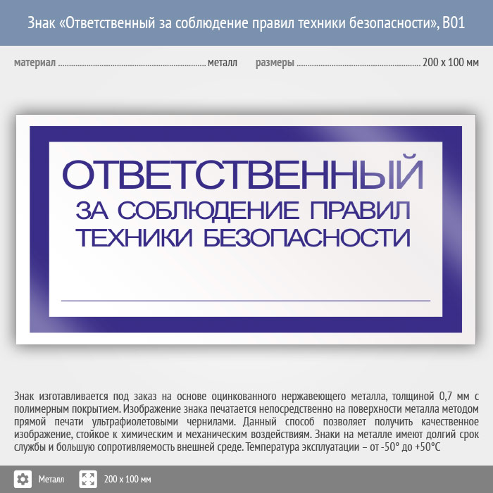 Знак «Ответственный за соблюдение правил техники безопасности», B01 (металл, 200х100 мм) в Ульяновске купить