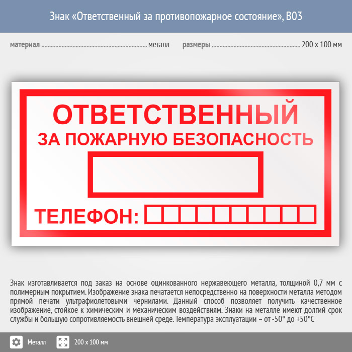 Знак «Ответственный за пожарную безопасность», B03 (металл, 200х100 мм) в Ульяновске купить