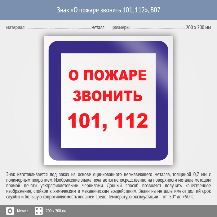 Знак «О пожаре звонить 101, 112», B07 (металл, 200х200 мм) в Ульяновске купить
