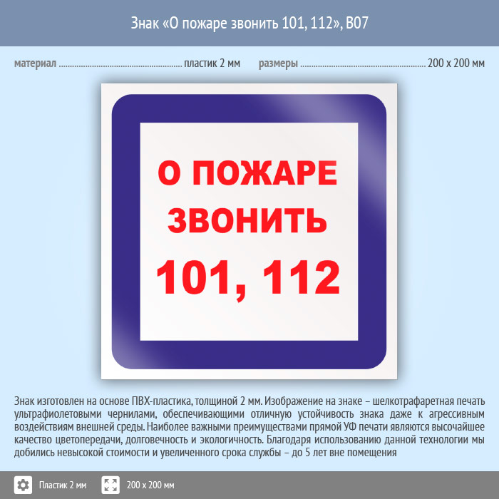 Знак «О пожаре звонить 101, 112», B07 (пластик, 200х200 мм) в Ульяновске купить