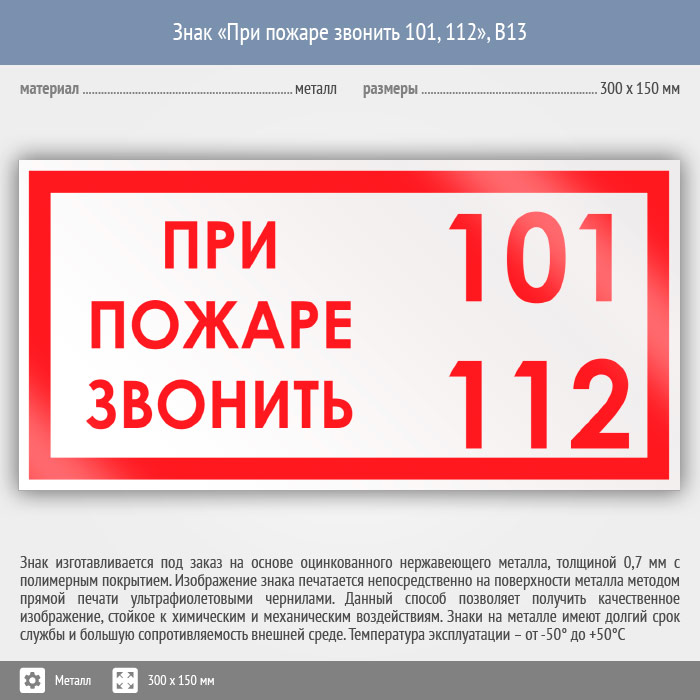 Знак «При пожаре звонить 101, 112», B13 (металл, 300х150 мм) в Ульяновске купить