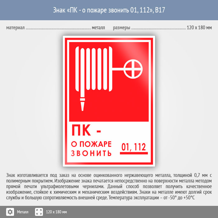 Знак «ПК - о пожаре звонить 01, 112», B17 (металл, 120х180 мм) в Ульяновске купить