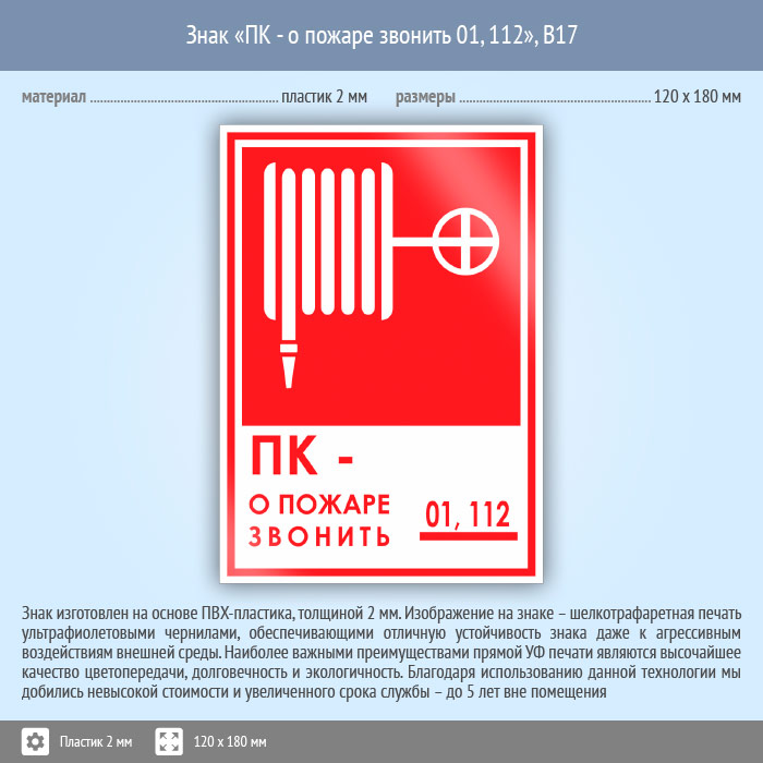 Знак «ПК - о пожаре звонить 01, 112», B17 (пластик, 120х180 мм) в Ульяновске купить