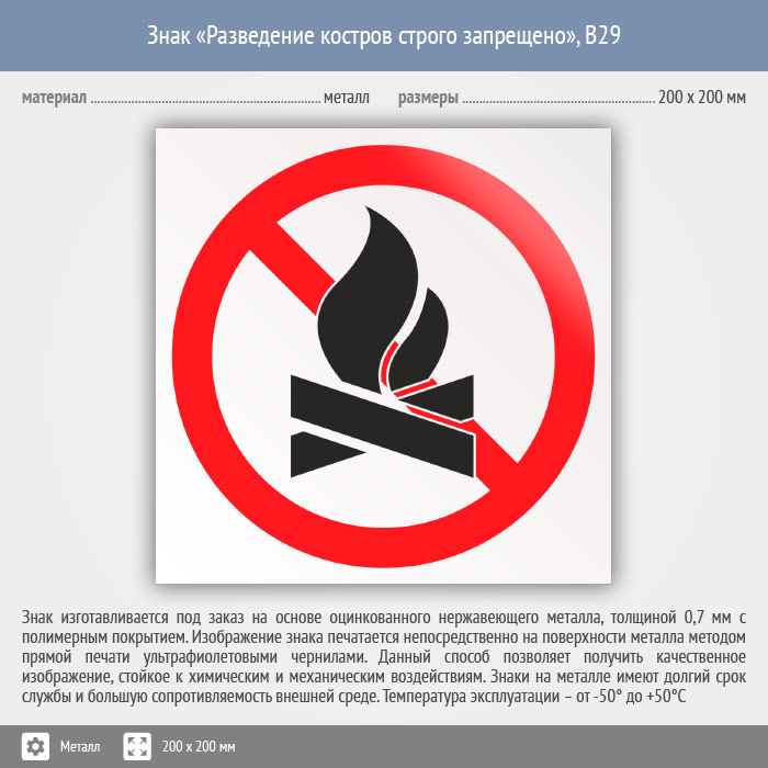 Знак «Разведение костров строго запрещено», B29 (металл, 200х200 мм) в Ульяновске купить