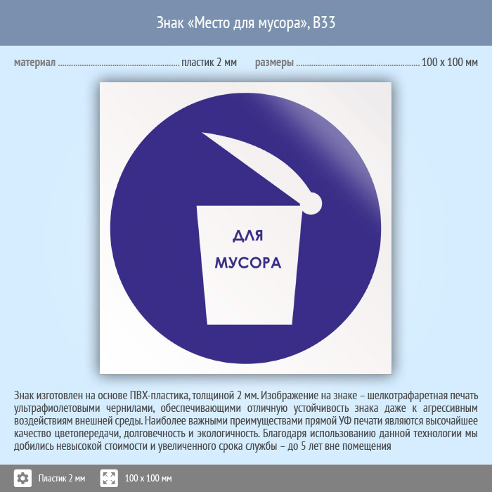 Знак «Место для мусора», B33 (пластик, 100х100 мм) в Ульяновске купить