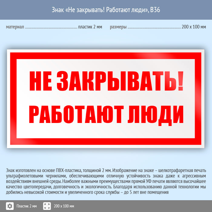 Знак «Не закрывать! Работают люди», B36 (пластик, 200х100 мм) в Ульяновске купить