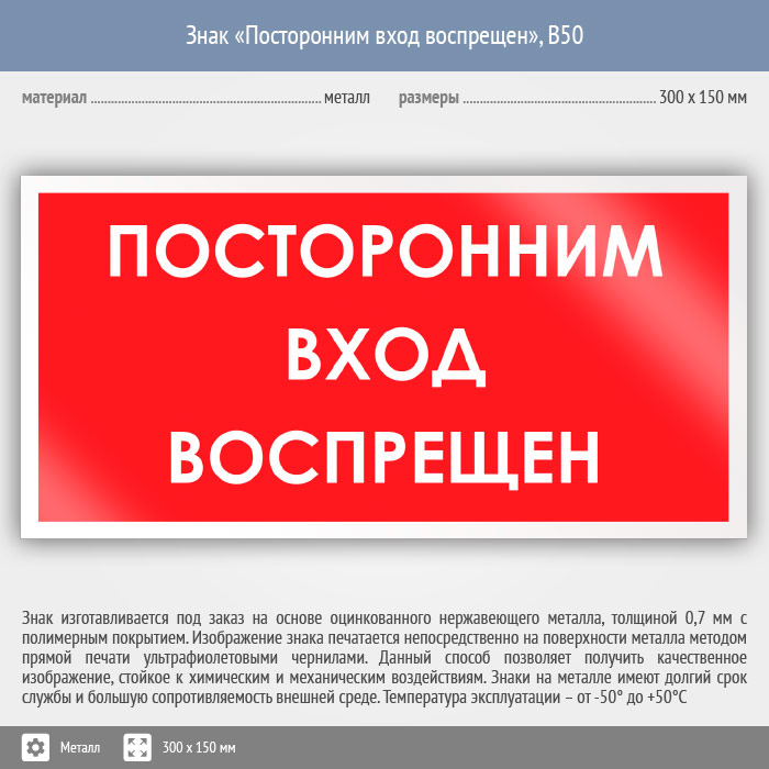 Знак «Посторонним вход воспрещен», B50 (металл, 300х150 мм) в Ульяновске купить