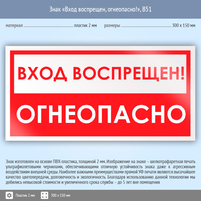 Знак «Вход воспрещен, огнеопасно!», B51 (пластик, 300х150 мм) в Ульяновске купить