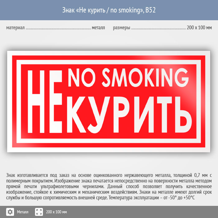 Знак «Не курить / no smoking», B52 (металл, 200х100 мм) в Ульяновске купить