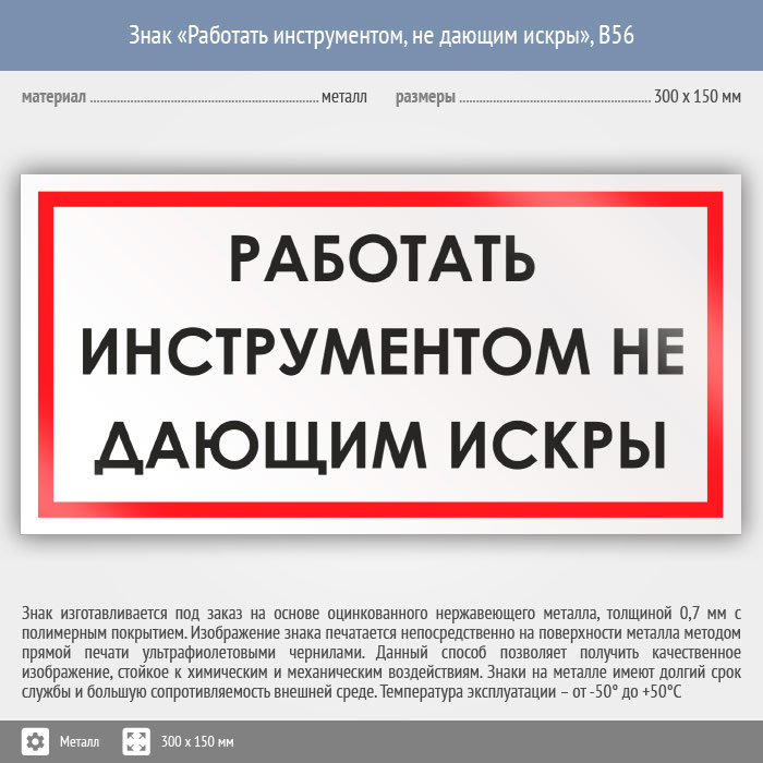 Знак «Работать инструментом, не дающим искры», B56 (металл, 300х150 мм) в Ульяновске купить