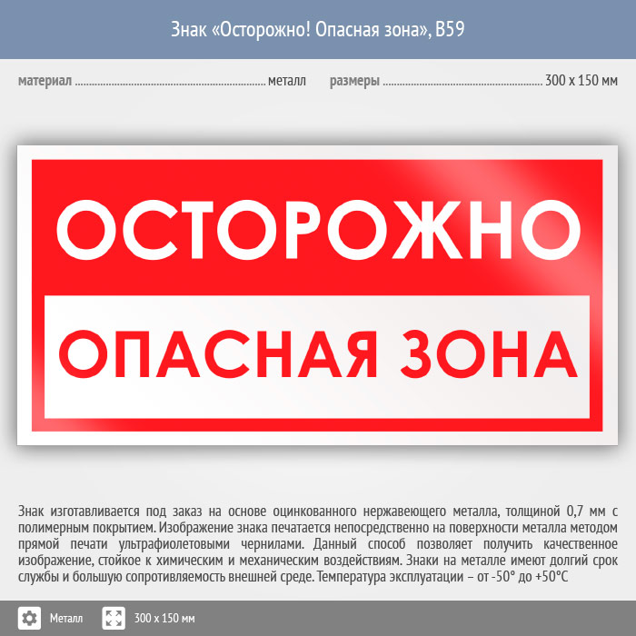 Знак «Осторожно! Опасная зона», B59 (металл, 300х150 мм) в Ульяновске купить