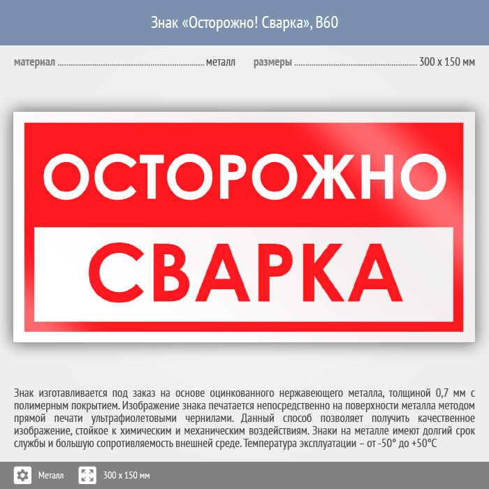 Знак «Осторожно! Сварка», B60 (металл, 300х150 мм) в Ульяновске купить