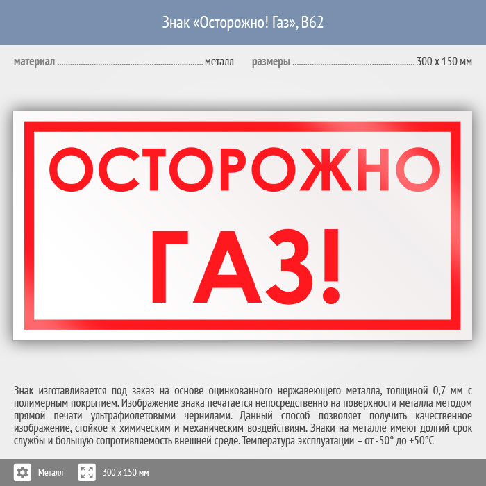 Знак «Осторожно! Газ», B62 (металл, 300х150 мм) в Ульяновске купить