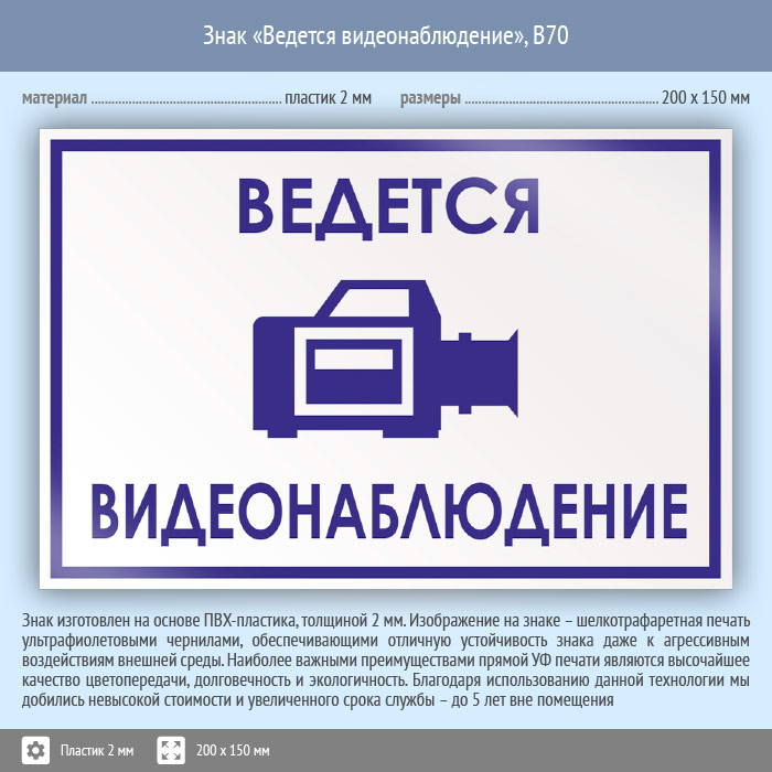 Знак «Ведется видеонаблюдение», B70 (пластик, 200х150 мм) в Ульяновске купить