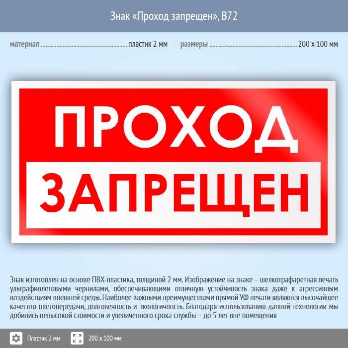 Знак «Проход запрещен», B72 (пластик, 200х100 мм) в Ульяновске купить