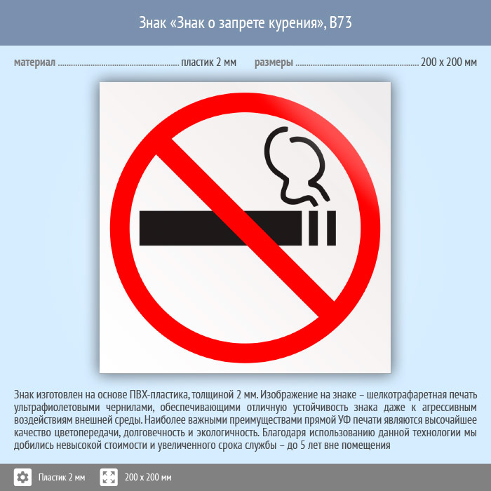 Знак «Знак о запрете курения», B73 (пластик, 200х200 мм) в Ульяновске купить
