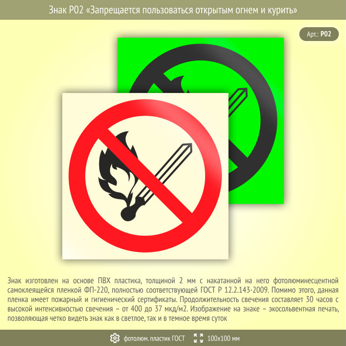 Знак P02 «Запрещается пользоваться открытым огнем и курить» (фотолюминесцентный пластик ГОСТ 34428-2018, 100х100 мм) в Ульяновске купить