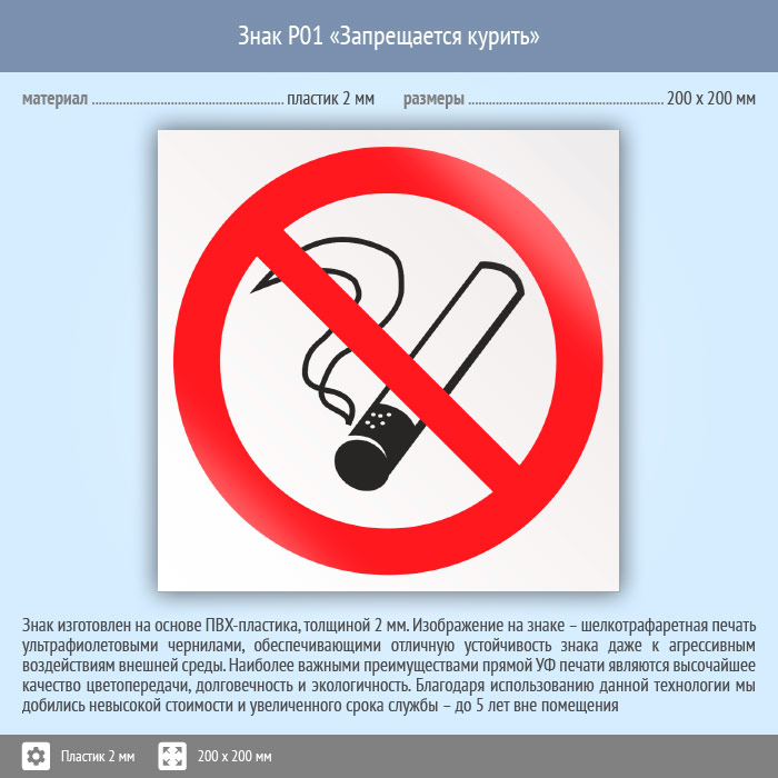 Знак P01 «Запрещается курить» (пластик, 200х200 мм) в Ульяновске купить
