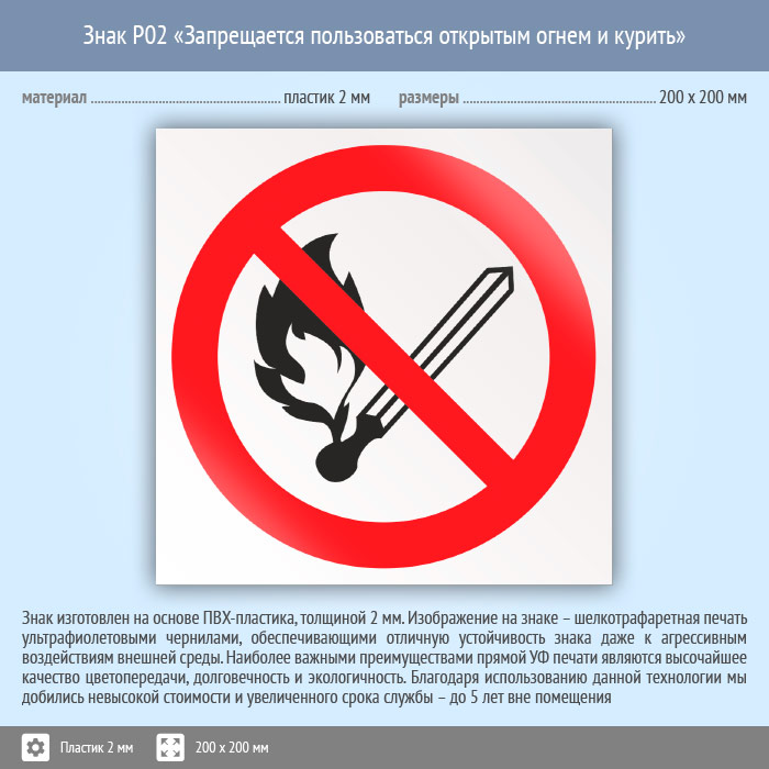 Знак P02 «Запрещается пользоваться открытым огнем и курить» (пластик, 200х200 мм) в Ульяновске купить