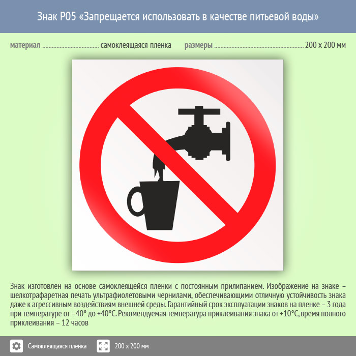 Знак P05 «Запрещается использовать в качестве питьевой воды» (пленка, 200х200 мм) в Ульяновске купить