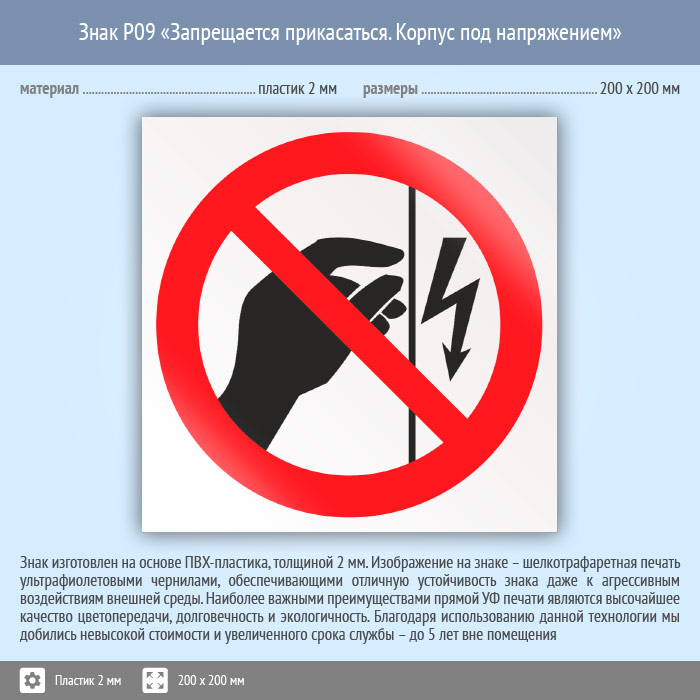 Знак P09 «Запрещается прикасаться. Корпус под напряжением» (пластик, 200х200 мм) в Ульяновске купить