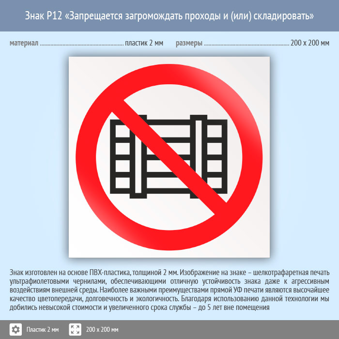 Знак P12 «Запрещается загромождать проходы и (или) складировать» (пластик, 200х200 мм) в Ульяновске купить