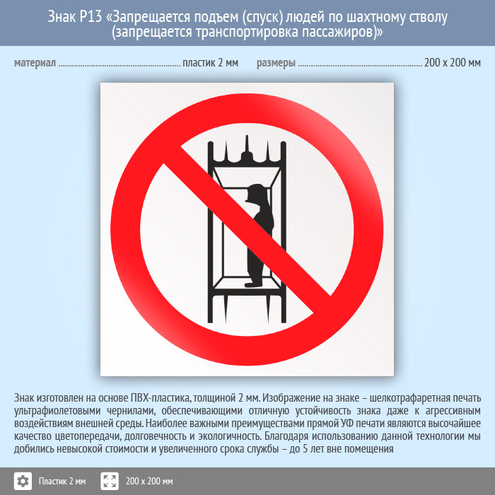 Знак P13 «Запрещается подъем (спуск) людей по шахтному стволу (Запрещается транспортировка пассажиров)» (пластик, 200х200 мм) в Ульяновске купить