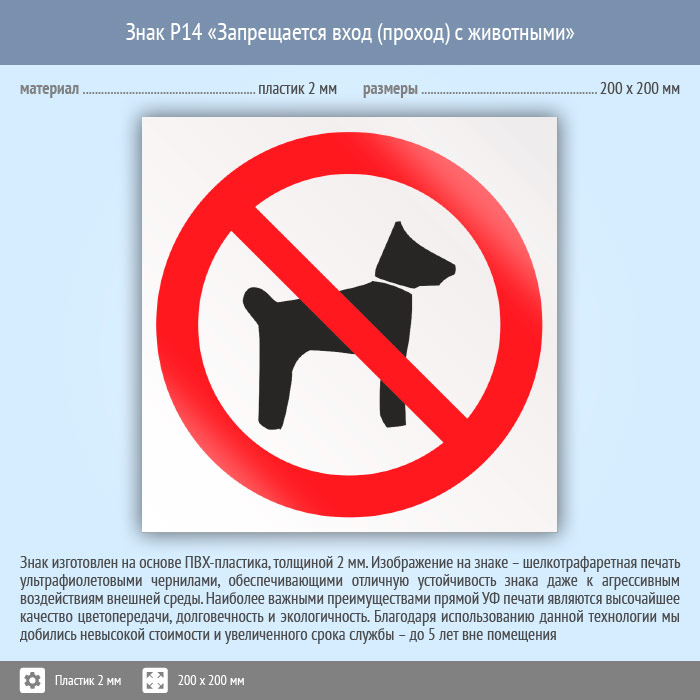Знак P14 «Запрещается вход (проход) с животными» (пластик, 200х200 мм) в Ульяновске купить