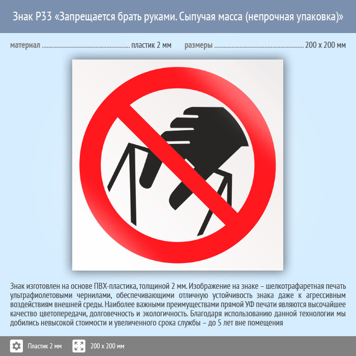 Знак P33 «Запрещается брать руками. Сыпучая масса (непрочная упаковка)» (пластик, 200х200 мм) в Ульяновске купить