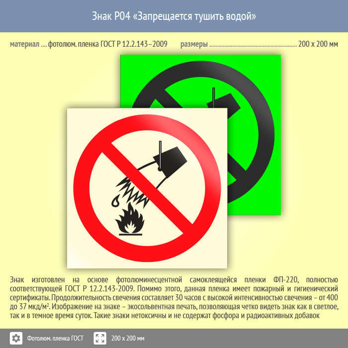 Знак P04 «Запрещается тушить водой» (фотолюминесцентная пленка ГОСТ 34428-2018, 200х200 мм) в Ульяновске купить