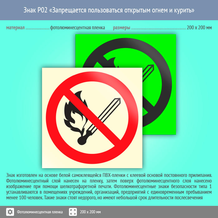 Знак P02 «Запрещается пользоваться открытым огнем и курить» (фотолюминесцентная пленка, 200х200 мм) в Ульяновске купить