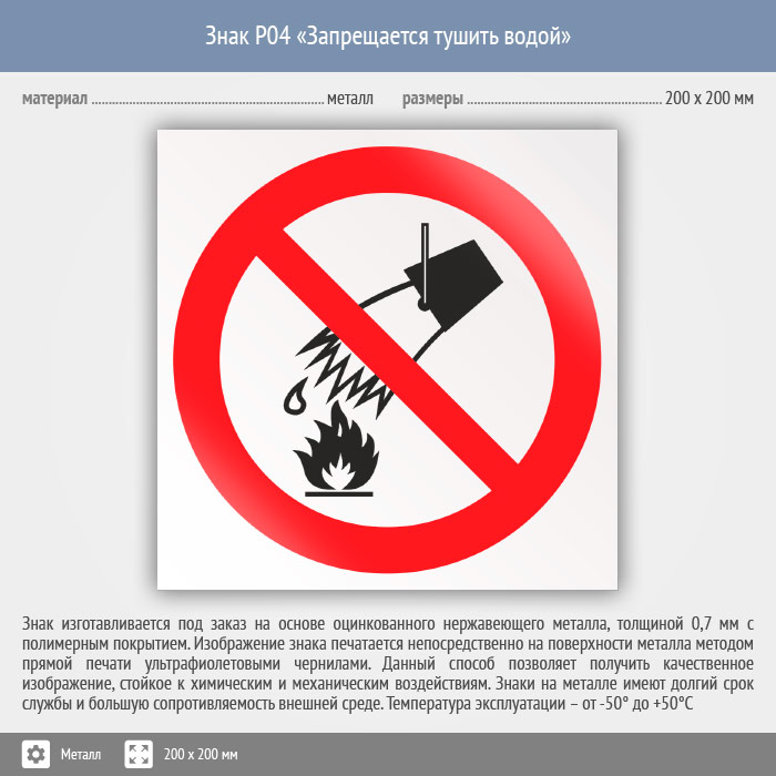 Знак P04 «Запрещается тушить водой» (металл, 200х200 мм) в Ульяновске купить