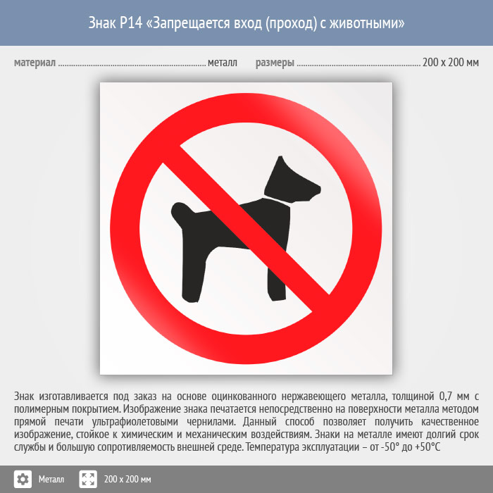 Знак P14 «Запрещается вход (проход) с животными» (металл, 200х200 мм) в Ульяновске купить