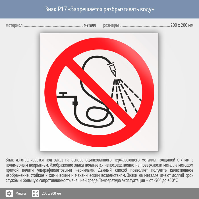 Знак P17 «Запрещается разбрызгивать воду» (металл, 200х200 мм) в Ульяновске купить