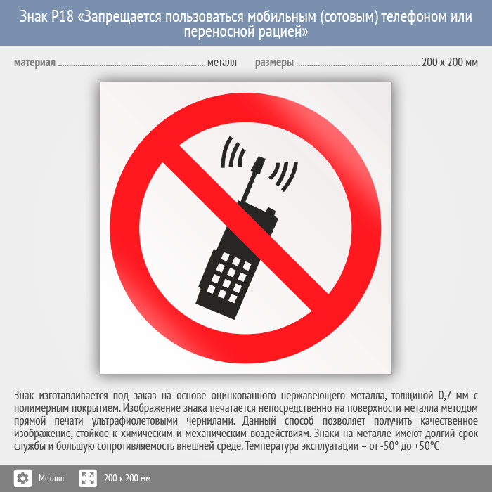 Знак P18 «Запрещается пользоваться мобильным (сотовым) телефоном или переносной рацией» (металл, 200х200 мм) в Ульяновске купить