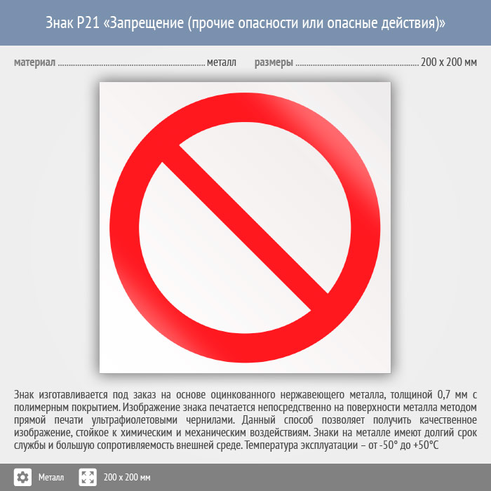 Знак P21 «запрещение (прочие опасности или опасные действия)» (металл, 200х200 мм) в Ульяновске купить