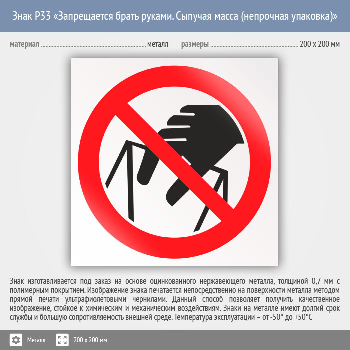 Знак P33 «Запрещается брать руками. Сыпучая масса (непрочная упаковка)» (металл, 200х200 мм) в Ульяновске купить