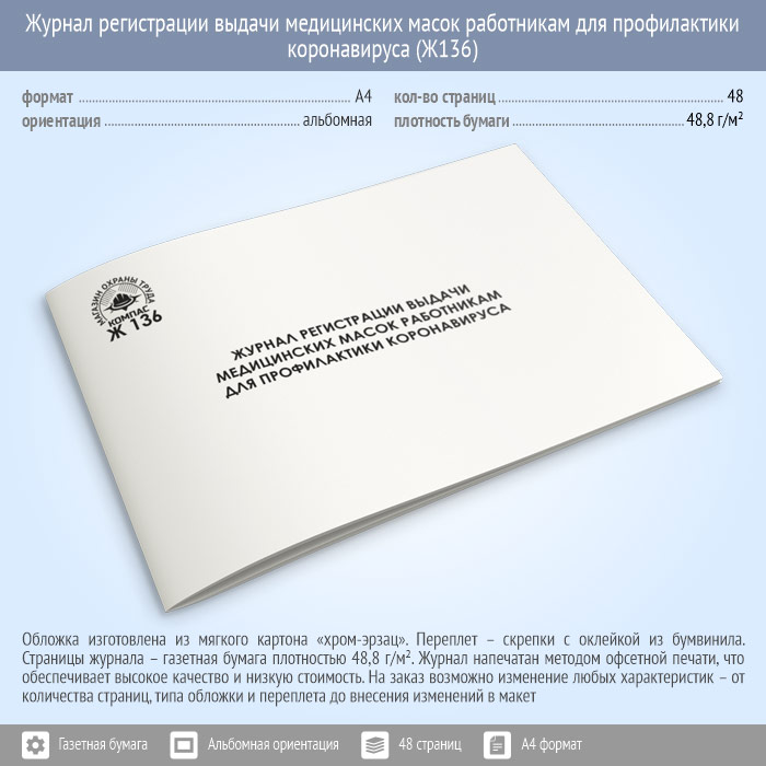 Журнал регистрации выдачи медицинских масок работникам для профилактики коронавируса (48 стр., Ж136) в Ульяновске купить