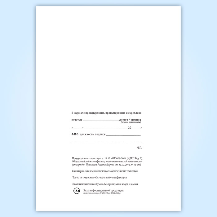 Вы получаете печатную продукцию прошнурованной и c местом для вашей печати в соответствии с действующими нормативными документами:
