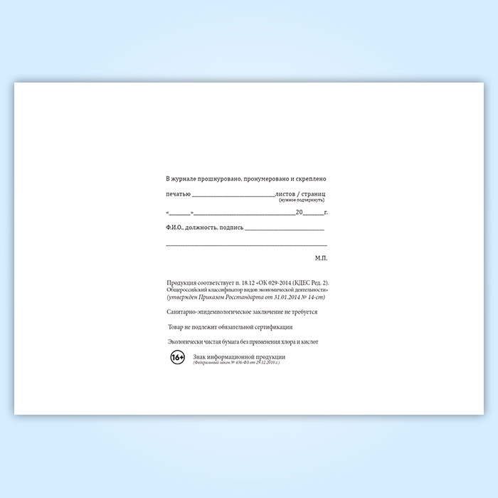 Вы получаете печатную продукцию прошнурованной и c местом для вашей печати в соответствии с действующими нормативными документами: