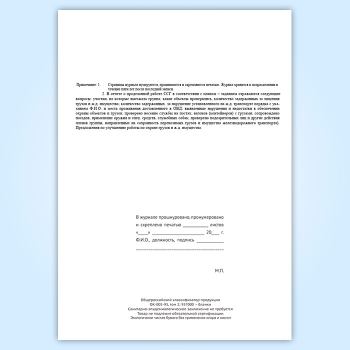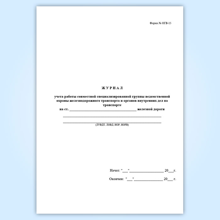Журнал учета работы совместной специализированной группы ведомственной охраны железнодорожного транспорта и органов внутренних дел на транспорте (форма № ОГВ-15) в Ульяновске купить